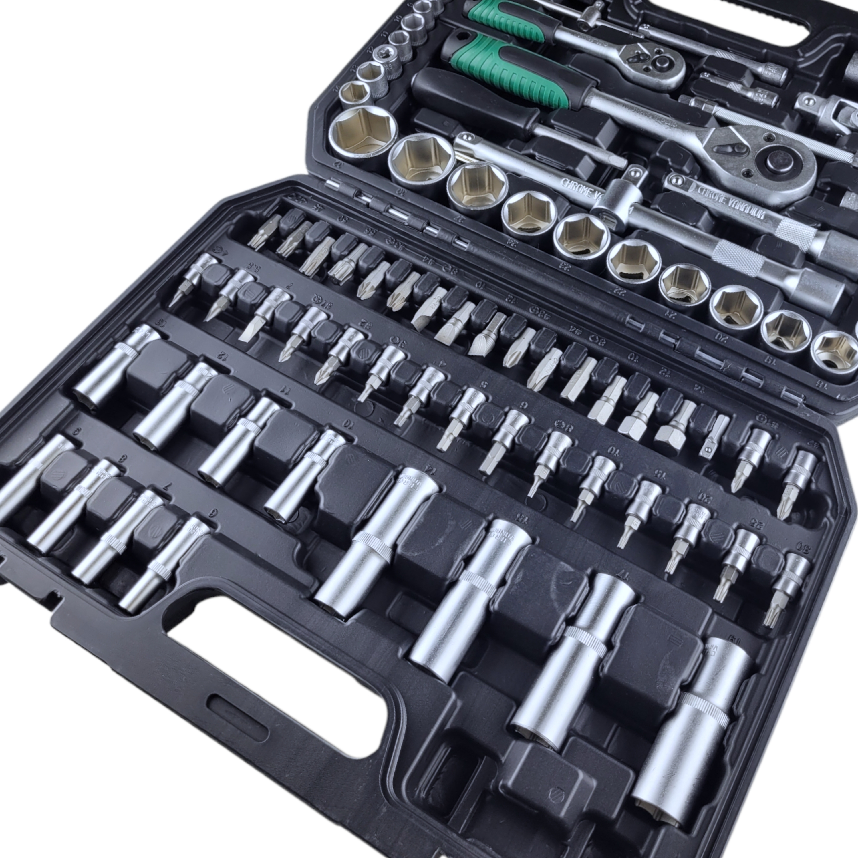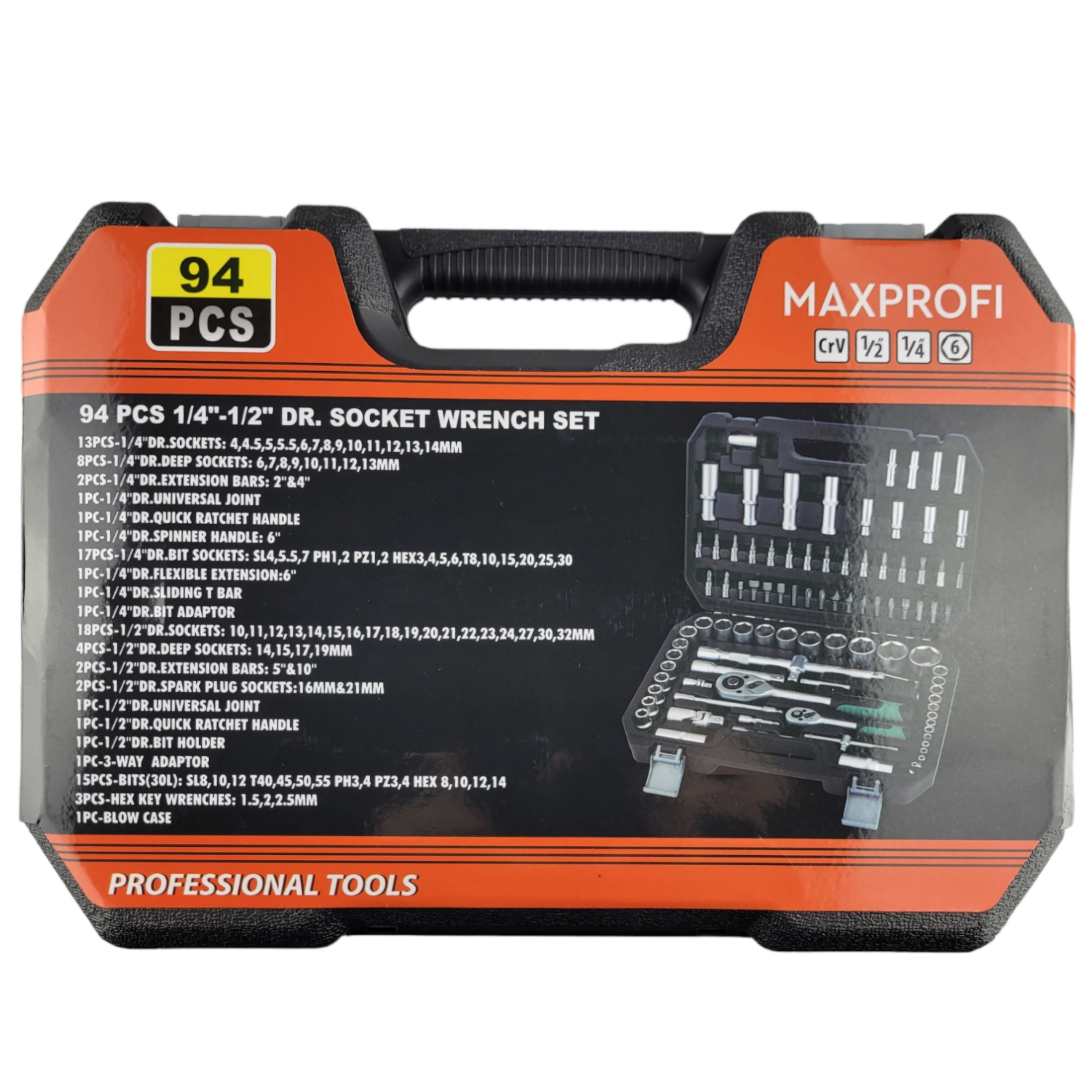Набор инструментов для авто 94 предмета имеет в комплекте ключи-трещотки с обратным реверсом и удобными двухкомпонентными рукоятками. Поставляется профессиональный набор инструментов в удобном, закрывающемся кейсе для надежного хранения и транспортировки.