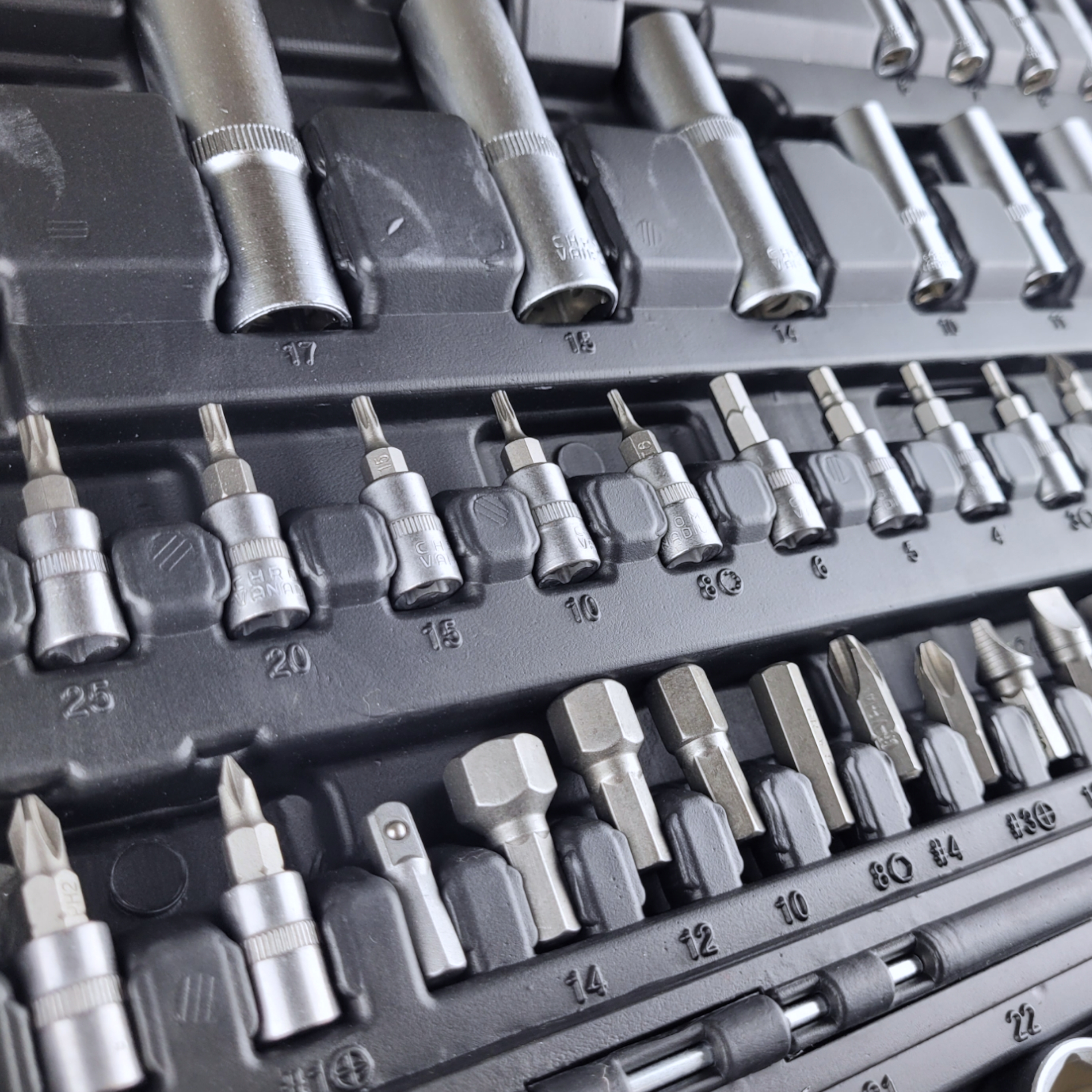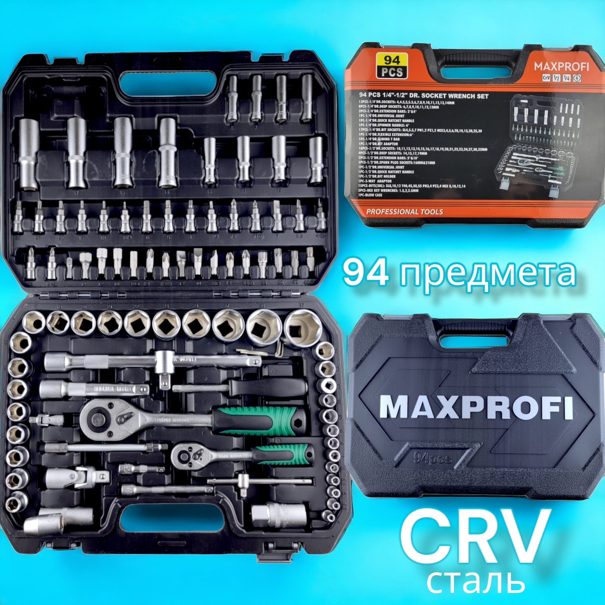Набор инструментов в чемодане 94 предмета включает в себя комплекты удлиненных и торцевых головок 1/4", биты Torx, крестообразные Pz и Ph, SL, HX. Имеются дополнительные элементы, позволяющие выполнять операции в труднодоступных местах быстро и эффективно. Каждый инструмент промаркирован и занимает свое отдельное место. Все детали из представленного набора изготовлены из высокопрочной CRV стали и имеют высокий рабочий ресурс. Данный комплект станет прекрасным помощником для выполнения широко спектра ремонтных и монтажных работ с использованием крепежных элементов различных типов и размеров.