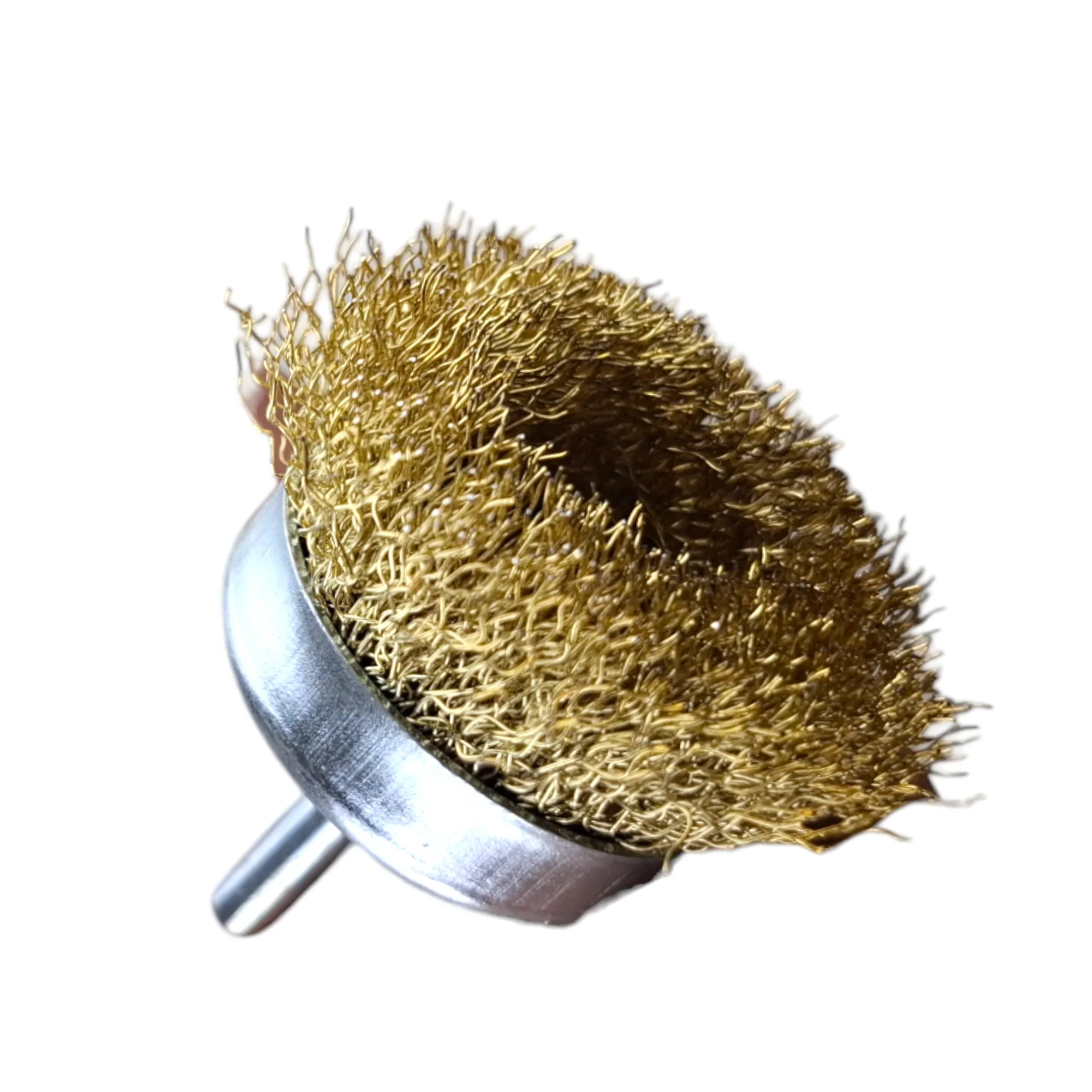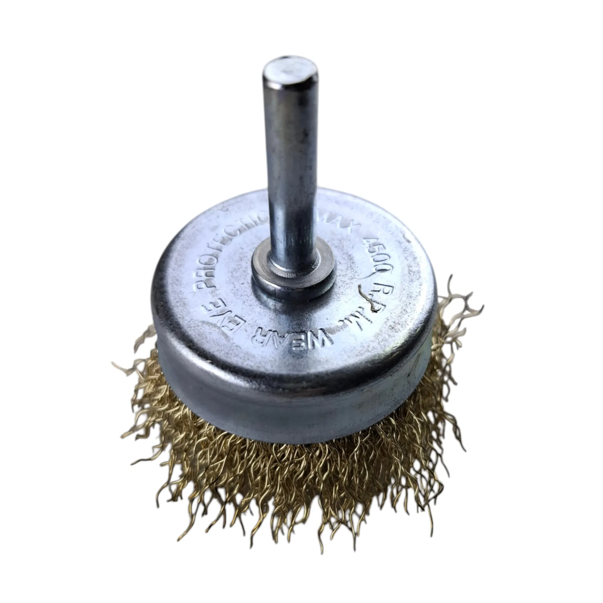Щетка для дрели чашечная 65 мм с волнистой латунированной проволокой от «MAXIMUM» — это качественная, универсальная и безопасная щетка для широкого круга слесарных и подготовительных работ с использованием дрели. Шпилька — цилиндрический хвостовик диаметром 6 мм — предназначена для установки в шуруповерты и дрели.