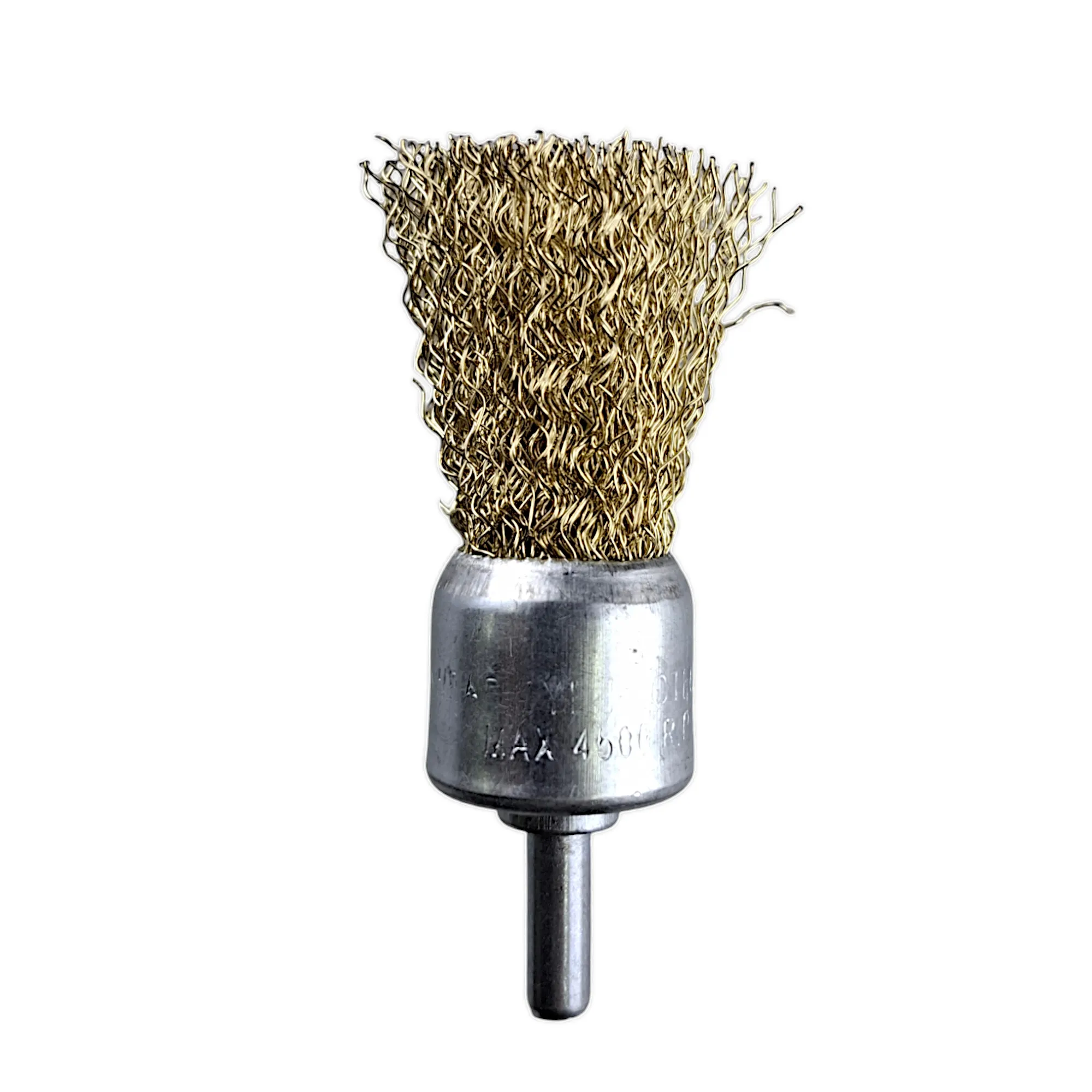 Это чашечная щетка с проволочной щетиной из латуни 25 мм от "MAXIMUMQUALITYTOOL". Латунированная щетка крепится на дрель или шуруповерт через резьбовую шпильку и предназначена для более специфичных задач, чем нейлоновая.