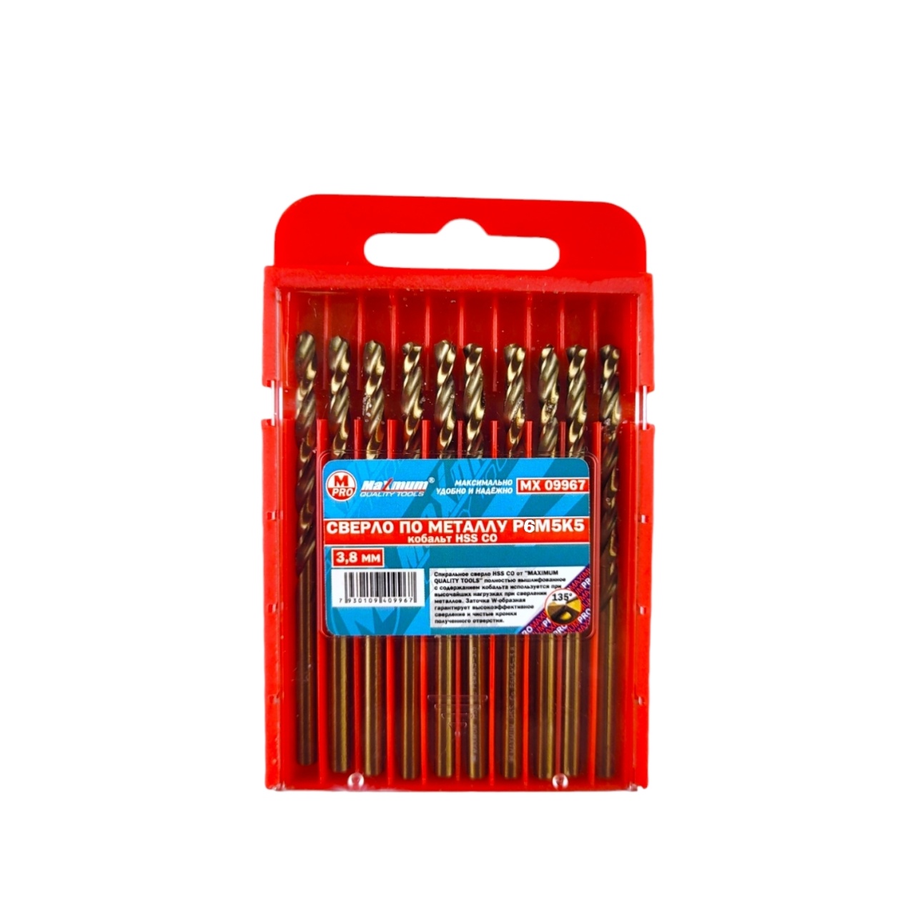 Сверла кобальтовые HSS из стали P6M5K5 от «Maximum Quality Tools» имеют цилиндрический хвостовик и общую длина: 70 мм. Рабочая часть закручена вправо. HSS сверло 3,8 мм с добавлением кобальта применяется для нержавейки, титана, легированных сталей, чугуна, дерева. Добавление кобальта придает жаропрочность – выдерживает температуру до 620-630°С. Обеспечивает быстрое и точное сверление отверстий. С данной оснасткой можно работать на повышенных скоростях резания – до 20 м/с.